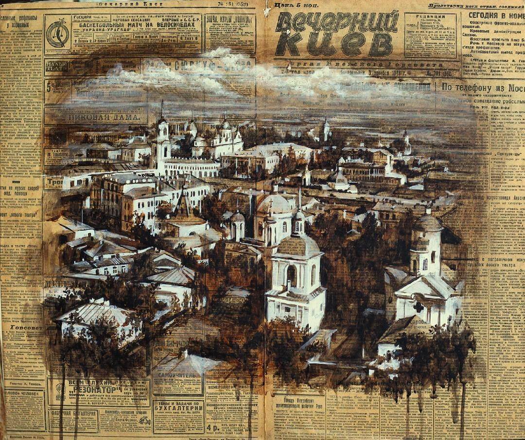 This is how Martha Nyrkova describes herself: "Artist, urban sketcher, restorer from Kyiv, Ukraine." As well as varying the medium, drawing and painting, she also chooses different materials for it. From artists' notebooks and paper, to newspaper pages. I really like this last one, as it adds a lot of character and contrast to the finished piece, by supporting and enhancing the art. Many buildings nicely detailed, to bring out the best from each one of them.