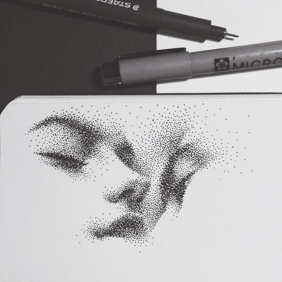 Canadian Artist Eric Wang is the creator of these delicate drawings. A fineliner is used to make dots and this is all this technique uses, hundreds, thousands and some times much more... little dots. To attain images, plus dark and light shadows, the artist, in this case Wang, varies the amount of dots in that area. The more the dots, the darker the area. Conversely, the fewer the dots, the lighter that area will be. Press the link, Stippling, to see more examples of this technique, here on DesignStack.