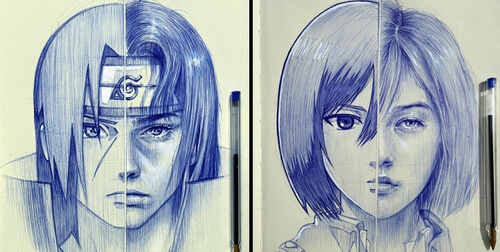 He specialises in portraits and facial features. He draws with both pencil and in ballpoint pen. Today's post revolves mainly around, but not exclusively, anime characters. There is one image, where Letor performes a little of a switch: He starts with a half drawing of his own face and then adds an anime version of it.
